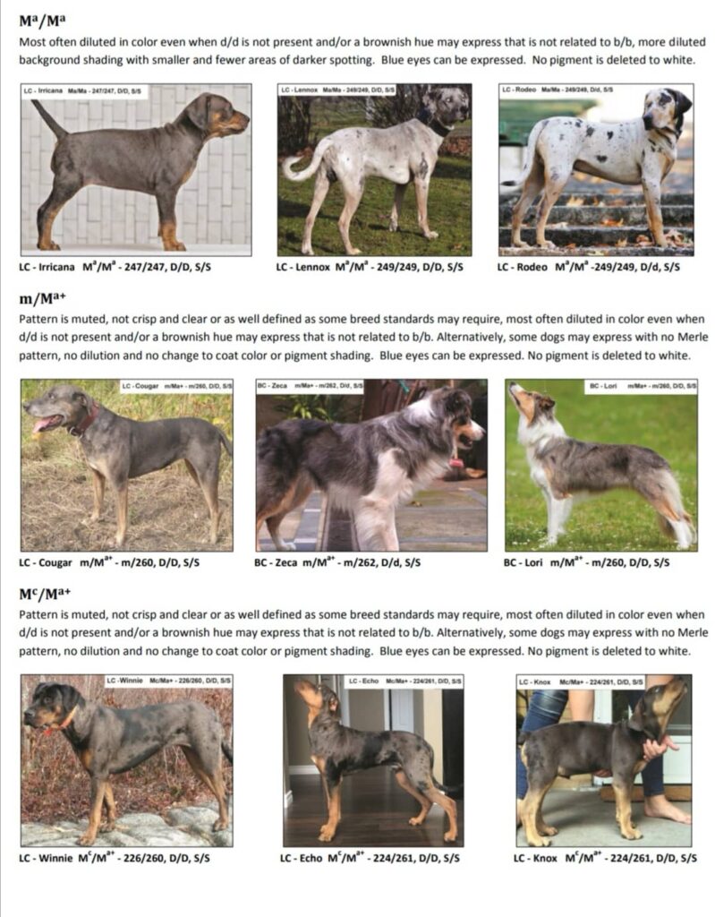 Vsi psi na slikah so testirani in dokazujejo, da fenotip ni enak genotipu. Slike so kopirane iz knjige M. Langevin, S. Pekova, T. Jancuskova: Merle-SINE Inseration from Mc-Mh “The Incredible Story of Merle” z dovoljenjem Mary Langevin.